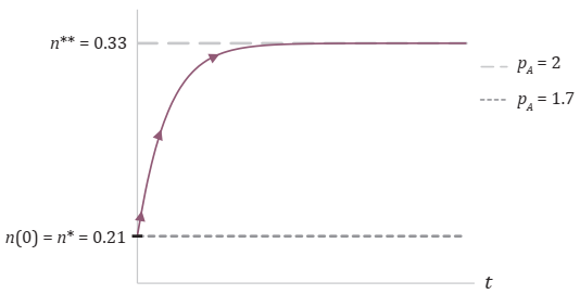 Utilizando los mismos valores de los parámetros de la sección anterior, la Figura 1 muestra la dinámica de n en el tiempo. Dado que n es una variable de movimiento lento, la condición inicial es n (0) = n* = 0.21 (cuando pA = 1.7). Por tanto, un aumento en los TI implica que wA > wM, por lo que la proporción de la mano de obra en el sector primario, n, aumenta lentamente y converge al nuevo nivel de estado estacionario n** = 0.33 (cuando pA = 2).