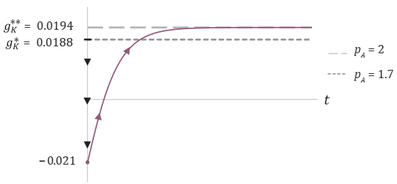 En la Figura 2 se tiene la trayectoria de gK en el tiempo. Considerando que en y , se tiene que el nivel de gK disminuye instantáneamente, tornándose negativo -como ya fue mencionado, este efecto se le conoce en la literatura como una desindustrialización directa (Ros, 2011)-. Como el tiempo avanza, , y el nivel de gK va aumentando hasta llegar a una mayor tasa de crecimiento, , que es igual a la del progreso técnico.
