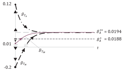 En la Figura 3 se muestran las trayectorias numéricas de gYA, gYM y gYIN. Usando la tasa de crecimiento del producto primario -ecuación (19)-, y dada la perturbación, se tiene que, en t = 0, gYA aumenta instantáneamente, debido a que gA aumenta y (n permanece en el mismo nivel del estado estacionario anterior). Después, como , el nivel de gYA va disminuyendo hasta alcanzar una mayor tasa de crecimiento de estado estacionario, . Nuevamente, considerando que en y , se tiene que gYM disminuye instantáneamente a un nivel negativo, para después converger al nuevo mayor nivel de estado estacionario, . Finalmente, la tasa de crecimiento del ingreso nacional disminuye instantáneamente. Es entonces que, como , el nivel gYIN aumenta hasta alcanzar una mayor tasa de crecimiento, . Cabe hacer notar que todas las tasas de crecimiento en el largo plazo convergen a una mayor tasa de crecimiento, que es igual a la tasa del progreso técnico, .