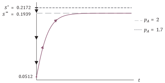 Por último, se estudia el comportamiento en el tiempo de la tasa de ahorro ante la perturbación. En la Figura 4 se tiene el comportamiento de la tasa de ahorro, ecuación (22), en el tiempo, para los valores numéricos considerados anteriormente. Así, en t = 0, la tasa de ahorro disminuye instantáneamente para después comenzar a aumentar hasta alcanzar su nuevo menor nivel de estado estacionario, s** = 0.193.