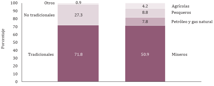 La economía peruana resulta un caso interesante de estudio, dado que es una típica economía exportadora de materias primas. Como se observa en la Figura 5, la particularidad de Perú es que ha sido dependiente en sus sectores exportadores tradicionales primarios, como la minería y los hidrocarburos (las participaciones no han variado mucho en el tiempo). Por tanto, en esta sección se presenta un modelo econométrico para el crecimiento económico de Perú en correspondencia con sus TI.