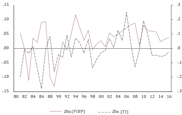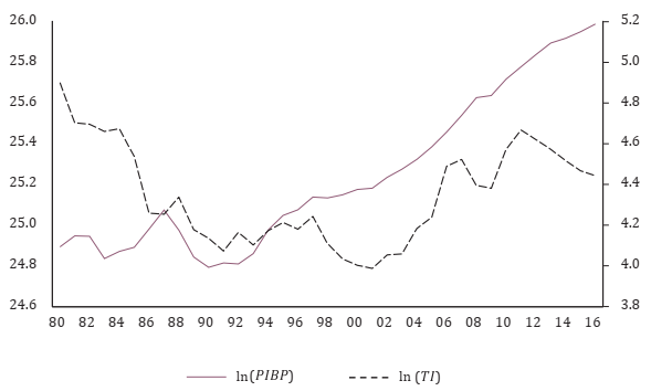 Los datos del PIBPt y TIt de Perú tienen periodicidad anual, están en términos reales con base 2010 y comprenden el periodo 1980-2016 (datos del Banco Mundial [BM], 2018a y 2018b). Los TIt se determinan como