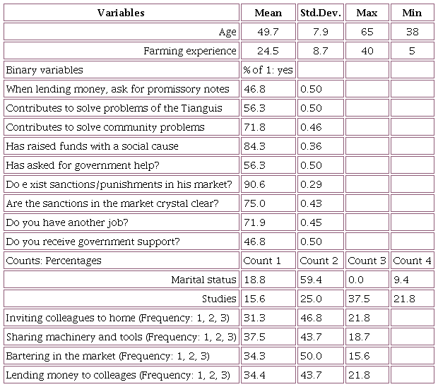 Table 2 reports descriptive statistics of sample of small-scale farmers responding our DCE (N= 146) . The average producer is 50 years old, with 24 years of farming experience. Around 60% of respondents are married. In terms of variables reflecting social cohesion, 47% of respondents invite colleagues to home at least three times per year; 44% of respondents share machinery and tools; 50% has bartered in the market; and 44% have lent money to the people in his community.