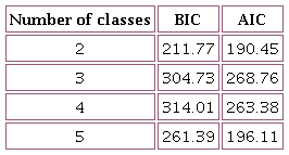 Results from LCL specifications are useful to document heterogeneity in preferences because they yield vectors of preferences by class -i.e.. The researcher estimates as many LCL specifications as classes believes are worth trying, and a preferred LCL specification is chosen based on likelihood criteria that penalize the improvement in likelihood fit due to the increase in estimated parameters -Bayesian Information Criterion (BIC) and Akaike Information Criterion (AIC) are the usual suspects.