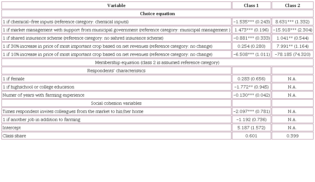 Table 4 reports coefficients from our preferred two-class latent class logit model. This model is composed of two equations -choice equation and membership equation. The choice equation has been informed with attributes of our DCE. The membership equation has been informed with respondents’ characteristics -such as gender, education, and years of farming practice- and social cohesion variables -such as number of times that respondent invites colleagues from the market to his/her house.