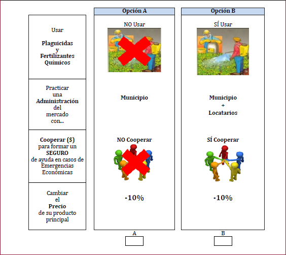 Resultados: 60% of encuestados no está dispuesto a utilizar insumos libres de químicos, está interesado en recibir apoyo administrativo del municipio, y no está interesado en un seguro compartido. Por otra parte, 40% de los encuestados está interesado en usar insumos libres de químicos, no está interesado en el apoyo administrativo, y está dispuesto a participar en un esquema de seguro compartido.