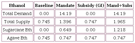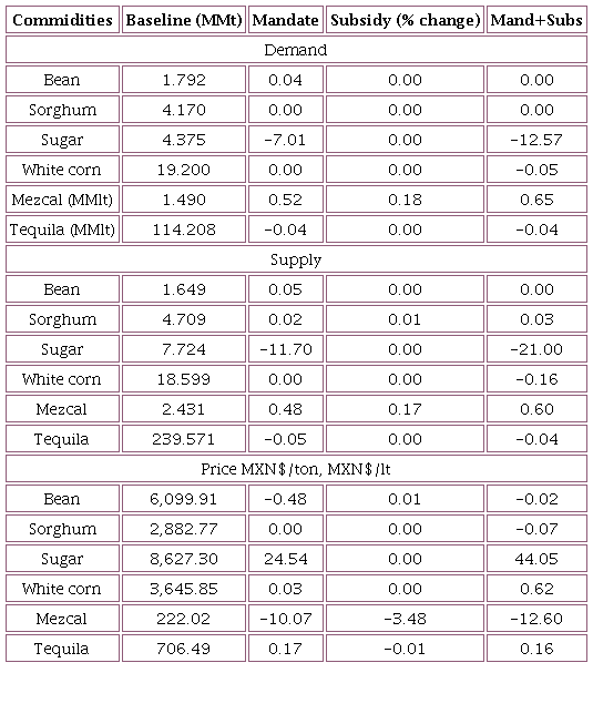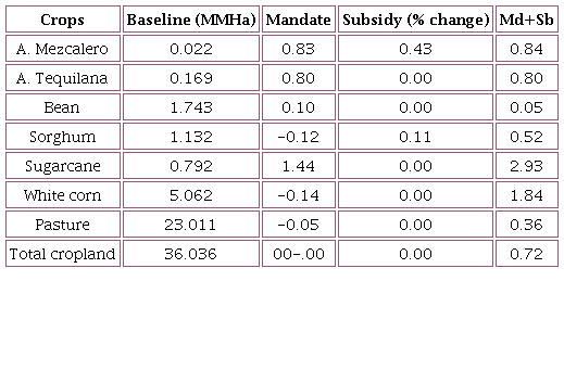 The purpose of this article is not to send a pessimistic prospective against the development of a domestic ethanol market and it is not either to prescribe a single best choice for the policy instruments considered here. Rather, the analysis aims to call the attention of the industry (e.g., agave, sugarcane, automotive) and the government to start providing incentives and commands to both the demand and the supply sides since now. The empirical results presented here can provide useful guidance for the government and the industry. For instance, these results could guide domestic biofuel industry to compensate a reduction in the world supply due to changes in trade or environmental policies from other countries. Since ethanol production would be low under the policies in consideration, the model can become a useful tool to assess future policies that aims to develop a domestic biofuel market such as international trade tariffs, tax policies, law enforcement by regulatory agencies, or environmental policies.