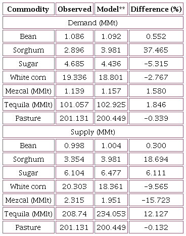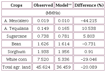 The data inputs include the base year domestic and global commodity prices and quantities de manded, historical crop mixes (areas planted to individual crops), crop yields, costs of production and processing, and cost of transportation. Crop mixes are restricted to the 2000-2013 data. Mexico is disaggregated into 193 districts. The crop sector includes: Agave tequilana Weber variety Blue (hereafter referred to as A. tequilana), Agave species for mezcal production (hereafter referred as A.mezcalero), alfalfa, barley, beans, yellow corn, white corn, corn silage, fodder grass, green chili pepper, oats, oat silage, orange, sorghum, soybeans, sugarcane, and wheat. In addition to crops, the model includes the pasture area, where cattle are raised and six processed goods: tequila and mezcal from Agaves; soybean oil and soybean meal from soybean; sugar from sugarcane; and ethanol from sugarcane and agaves’ residues.