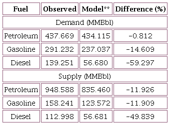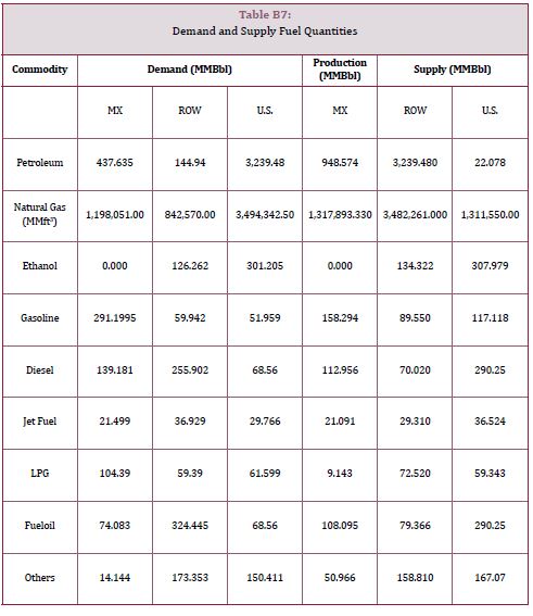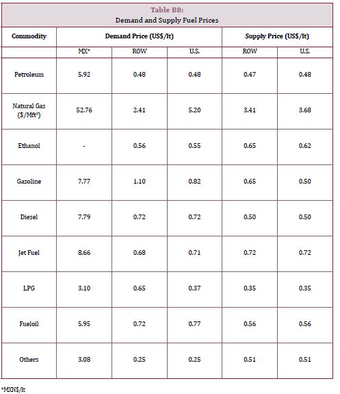 In the fuel sector module, the Mexico components consider the total amount of transportation fuel to generate transportation output. Fuel prices, demand and supply quantities data are obtained from EIA (2019) for the U.S., which includes ethanol, and from Anuario Estad´ıstico for Mexico. For the supply of gasoline, diesel and jet fuel in Mexico, the model uses a price at the refinery gate of MXN$7.34, $7.72, $7.31 per liter Anuario Estadístico (average 2008-2013), respectively. On top of these, taxes, subsidies, marketing margins and transportation costs are added to build the demand curves.