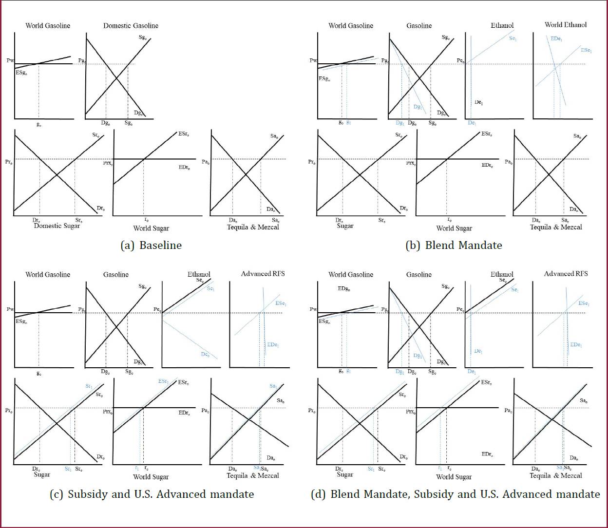 The relevance of this advanced mandate is explained in Figure 1, that shows intuitively some expected results under three scenarios: an ethanol mandate, a subsidy to ethanol producers, and both policies combined. Figure 1(b) shows that imposing a blending mandate shifts gasoline demand to the left, but ethanol would be imported from the U.S., so no further changes would occur in the Mexican sectors. When a subsidy is in place, it works the other way around, supply of ethanol shifts to the right, but producers prefer to export it to the U.S. that needs to satisfy the advanced mandate with the Mexican ethanol as shown in Figure 1(c). In addition, supply of sugar and spirits shifts to the left. Finally, when both policies are combined, gasoline demand shifts to the left, and ethanol can move in different directions, for instance as shown in Figure 1(d), Mexico could export the domestic ethanol production to the U.S. for the advanced mandate, and import corn ethanol from the U.S.