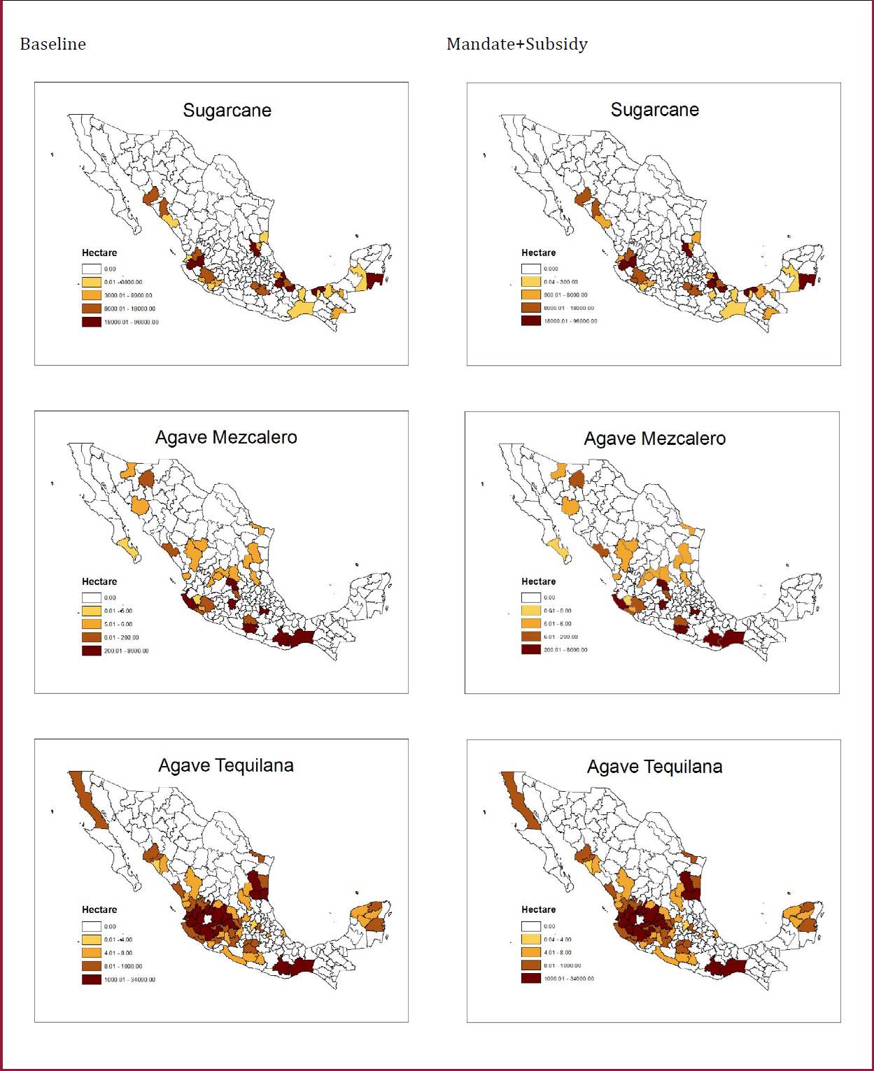 Since not enough domestic ethanol is produced even in the presence of a mandate and a subsidy, no significant amount of land would be required to produce additional ethanol since a large portion would come from agave, which would need only 1.6% more land as depicted in Table 3, while sugarcane would expand about 3%. Similarly, area planted for most of crops increases slightly (total area would increase 0.72%) respect to the baseline acreage due to the assumed demand and yields projected, which are figures that deserve a deeper analysis, but any significant change is unlikely in the main results. Maps in Figure 2 display agave and sugarcane allocation across the country under both baseline and the subsidy and mandate scenario. When comparing both scenarios, we can see that landscape picture for both agave crops will remain virtually unchanged, while sugarcane will expand in the Gulf and Southern regions (i.e., Veracruz, Tabasco, and Oaxaca states). In terms of production, surprisingly, mezcal production increases even when ethanol from agave is produced such as Table 4 shows, while sugar production decreases significantly mainly due to the reduction of the domestic demand and the higher ethanol production.