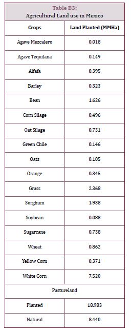 GHG emissions are calculated for all crops, fuels, and pasture based on the above-ground CO2 equivalent emissions (CO2e). GHG emissions for crops include CO2e generated from input factors, machinery, and transportation. Regards to biofuel crops, sugarcane net emissions are 2,807 kg C02e/ Mt, while for agaves, a CO2e net absorption of 25,000 kg C02e/Mt is assumed.