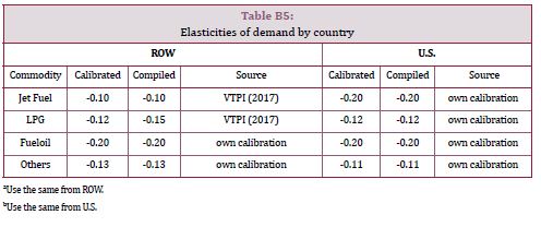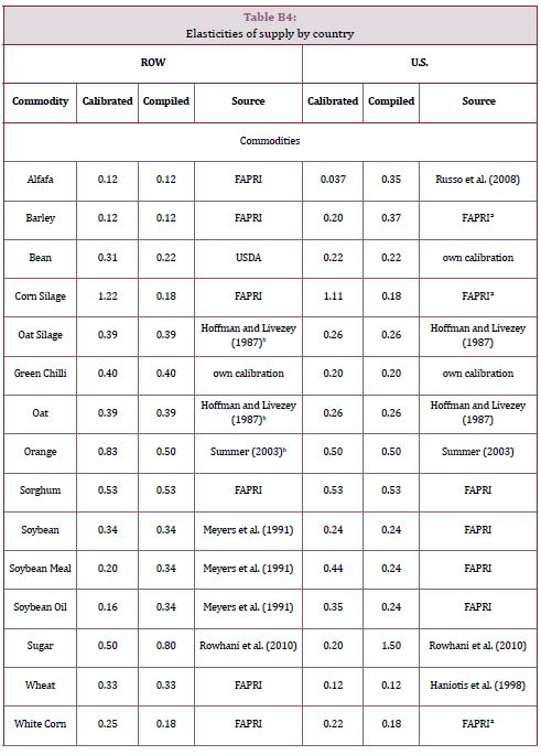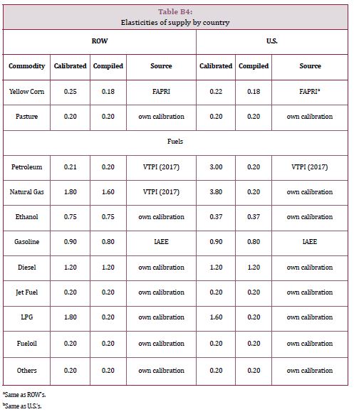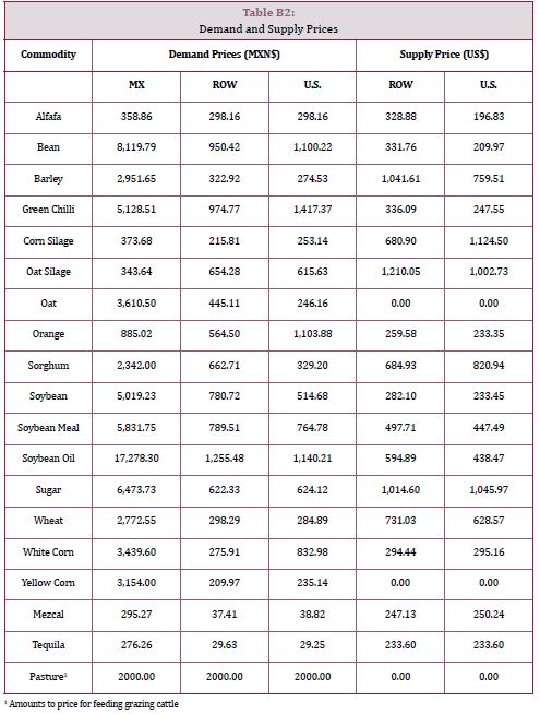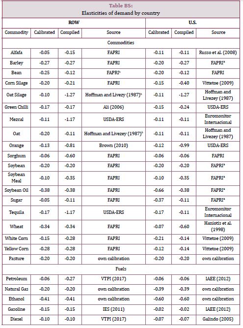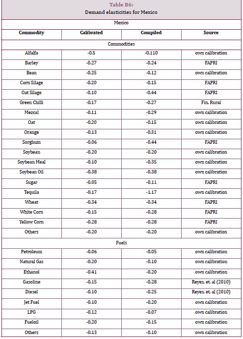 When specifying the agricultural commodity demands, the model uses 2008 as the base year, the prices and quantities as reported in SIAP (2015), CRT (2015), CRM (2015), USDA-FAS (2015) for Mexico, USDA-NASS (2016), USDA-FAS (2015), Comtrade (2015) for U.S. and ROW. The price elasticities for Mexico, U.S. and ROW used in the demand functions are obtained from various sources, including USDA-ERS (2015), FAPRI (2015), Meyers et al. (1991), Rowhani et al. (2010), Euromonitor Internacional (2014), Chen et al. (2011), IndexMundi (2014), Hoffman and Livezey (1987), Summer (2003), Russo et al. (2008), Haniotis et al. (1988)Ali (2006), Brown (2010), and Vittetoe (2009). For fuels, elasticities where also gathered from different sources (e.g. Galindo, 2005; Crotte et al., 2010; Havranek et al., 2012; Reyes and Matas, 2010).