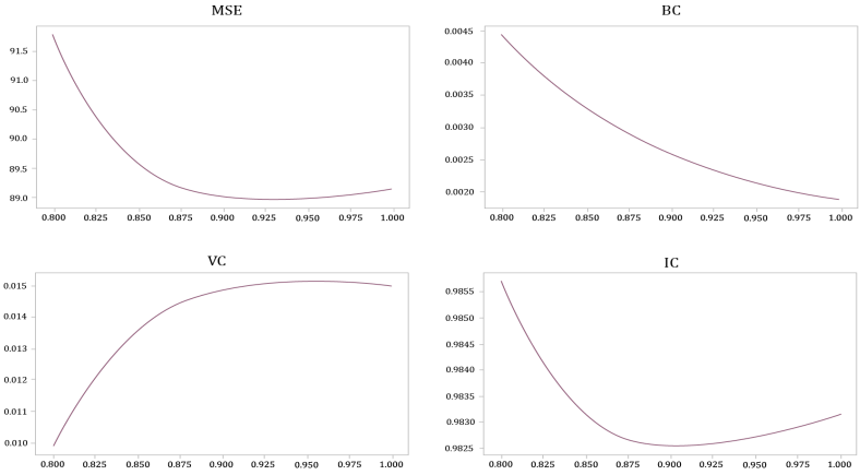 It is to be observed that the delta for the option using the derivative of integer order corresponds to the choice As can be seen in all the figures, the error to which the forecast is subject in the classic, integer order case, can be reduced using a conformable derivative operator. In fact, the convexity of all the error functions shows that the slight non-linearity induced by the term in equation (6) allows for a more accurate forecasting of prices and, thus, a more precise hedging. To understand these better, the mean squared error and its decomposition into bias, variance, and irregular components is shown in Figure 2. Clearly, bias is a decreasing function of parameter α, which in turn implies that the classical integer order delta provides the best hedging in terms of bias, that is, it minimizes bias.