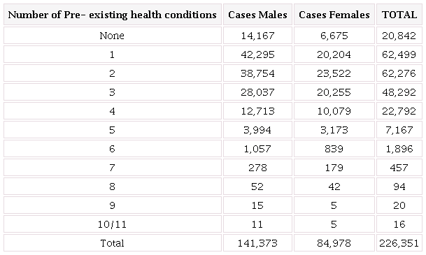 If we were to closely measure the impact of a particular comorbidity on the expected number of deaths, we would have to eliminate all cases where the patient had more than one comorbidity. A total de 830,332 cases would be eliminated, including 143,015 cases of death. For this reason, we decided to keep all cases. We should keep in mind, therefore, that our estimate of the comorbidity impact of death would be biased24.