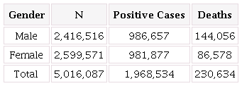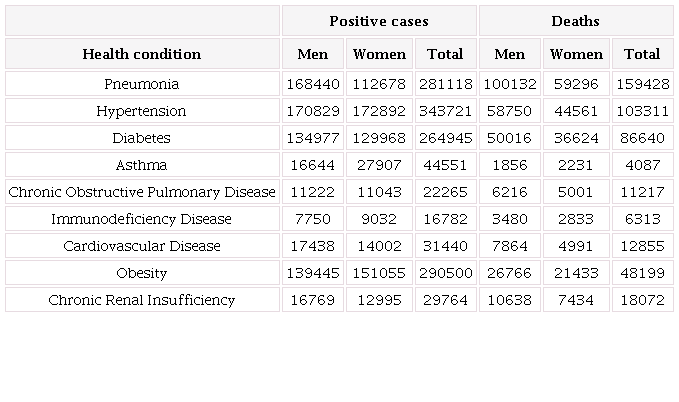 Table A.5, in the Appendix, reports the number of positive cases and deaths for women and men for the different types of pre-existing conditions. It should be noted that the information about comorbidities is provided by the patient when he/she registered in the system. The health pre-existing condition most associated with the number of positive cases is Hypertension, followed by Pneumonia and Asthma. The sequential order does not change very much in the case of deaths because in this case Pneumonia is the leading disease associated, followed by Hypertension and Asthma23. Table A.6, on the other hand, presents the number of diseases associated with death. More than 51 % of total patients who died, had one or two pre-existing health conditions. The table also indicates that only 9.2 % of total deaths did not have any pre-existing health condition.