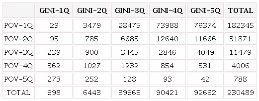 But the question about whether deaths are concentrated in municipalities with a high proportion of people living in poverty remains. Table 3 presents the distribution of the number of deaths by municipalities degree of poverty and income inequality21. The bulk of deaths were concentrated in municipalities with low levels of poverty and high degree of income inequality. That is, 65.2 % of total deaths fell in two groups of municipalities: (POV-1Q, GINI-4Q) and (POV-1Q, GINI-5Q).