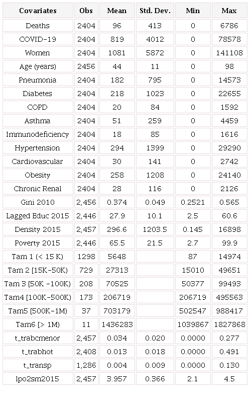 We now present covariates’ descriptive statistics. Remember that our unit of observation is the municipality. The municipal data is obtained by adding the number of cases of deaths, COVID-19 cases, women, pneumonia, diabetes, COPD, asthma, immunodeficiency, hypertension, cardiovascular, obesity and chronic renal. On the other hand, all socio-economic variables are at the municipal level using the “2015 Conteo de Población”, except for the inequality index (Gini coefficient), which is estimated using the 2010 population census.