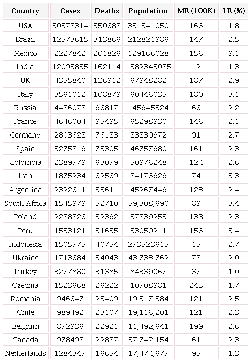 Worldwide, Mexico was one of the hardest hit countries by the virus. As of March 30th, 2021, there were 2,227,842 confirmed cases and 201,826 deaths5, which placed Mexico in third position after the United States and Brazil. Even if we consider the population, the mortality rate is still among the highest in the world: about 156 per 100,000 inhabitants. The percentage of infected people who died, was 9.1% which was the highest in the world6.