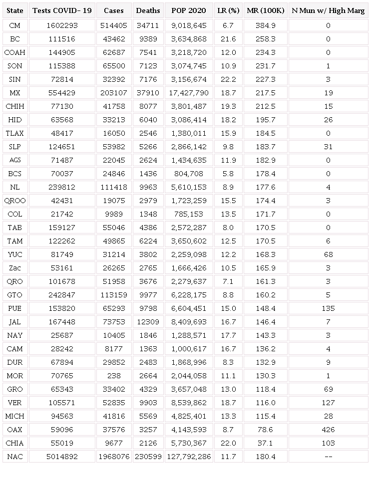 As of March 30th, 2021, Mexico’s mortality and lethality rates were 156 and 9.1 per 100,000 inhabitants, respectively16, which placed it among the hardest hit countries by COVID-19. At the state level, the mortality and lethality rates were significantly higher in some states17.