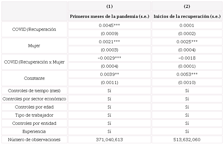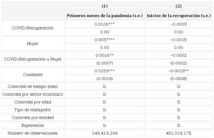 Para estimar los efectos diferenciados por sexo durante el periodo de inicios de la recuperación (posterior a los primeros meses de la pandemia) se utilizó el siguiente modelo: