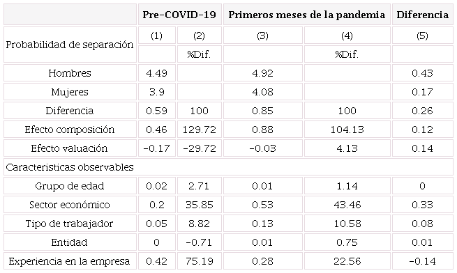 Las estimaciones de la Tabla 2 indican que, previo a la pandemia de COVID-19, la población de hombres contaba con una propensión a la separación 0.59 pp mayor a la de su contraparte de mujeres (columna 1, tercer renglón). Sin embargo, esta diferencia se incrementó a 0.85 pp durante la pandemia (columna 3, tercera línea). Además, es posible inferir que, tanto en el periodo pre-COVID-19 como durante los primeros meses de la pandemia, la experiencia es la principal característica observable que ayuda a explicar el diferencial entre los dos grupos poblacionales bajo análisis, seguido por el tipo de trabajador (permanente o eventual) y la distribución sectorial. Asimismo, se observa un incremento relativo de 0.26 pp en la probabilidad de separación entre hombres y mujeres (columna 5, tercer renglón). Al analizar los factores que explican dicho aumento relativo en las probabilidades de separación entre hombres y mujeres, es posible identificar que la distribución de los trabajadores por sector y el tipo de trabajo (permanente o eventual) son los elementos que explican la mayor proporción de dicho incremento (ver columna 5, sección de características observables).