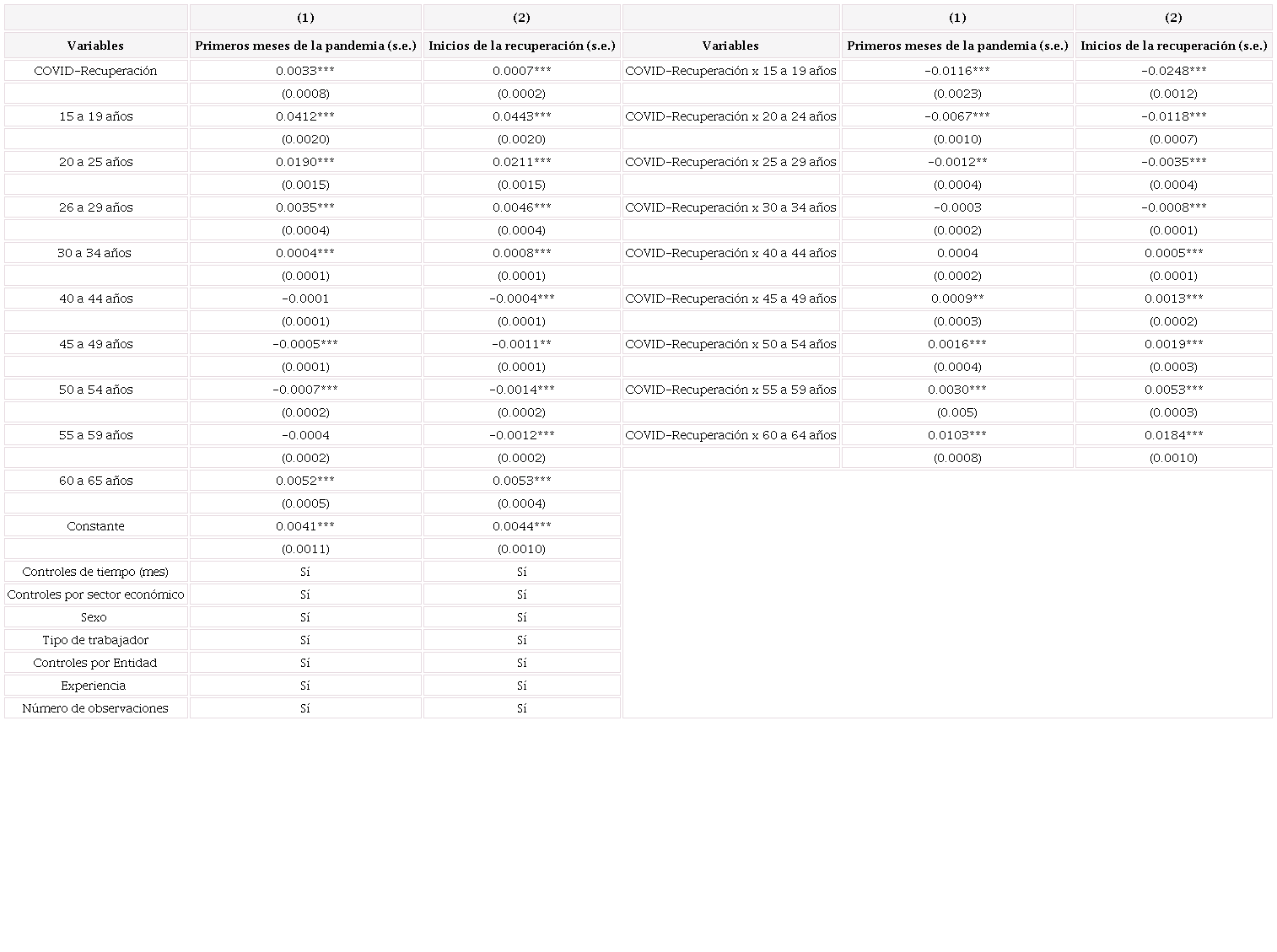 Al combinar estos resultados con los de la Tabla 4, las estimaciones muestran que los grupos más jóvenes presentaron afectaciones negativas en las variaciones de sus salarios en relación con el grupo base, pero menores caídas relativas en la probabilidad de separación del empleo, tanto en los primeros meses de la pandemia como en el periodo de inicios de la recuperación. Esto parecería sugerir que, para sobrellevar la difícil situación económica, las empresas conservaron, al personal más joven, en términos relativos al grupo de 35 a 39 años, si bien su salario fue más afectado.