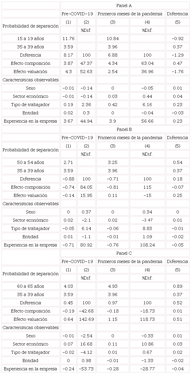 La Tabla 5 contiene los resultados de la descomposición Oaxaca-Blinder en el nivel nacional entre tres grupos de edad. El panel A contiene los resultados que comparan al grupo más joven (15 a 19 años) y el de 35 a 39 años (grupo base). Asimismo, se presentan ejercicios análogos para el grupo de 50 a 54 y el de 60 a 65 con respecto del grupo de referencia en los paneles B y C respectivamente. Los resultados muestran probabilidades de separación mayores en el grupo de trabajadores más joven, seguido por el de mayor edad, el de 35 a 39 y el de 50 a 54 años (en ese orden) tanto para el periodo pre-COVID-19 como en el correspondiente a los primeros meses de la crisis sanitaria. Además, se observa un incremento relativo en el diferencial de probabilidades entre el grupo de trabajadores entre 60 y 65 años con respecto del grupo base, pues el grupo de mayor edad presentó mayores incrementos en la probabilidad de separación entre los dos periodos. Asimismo, se identifica una reducción en el diferencial de probabilidades entre el quinquenio más joven y el grupo base, toda vez que el segundo registró un aumento mayor en la probabilidad de separación durante los primeros meses de la crisis sanitaria. Similarmente, se observa una reducción en la diferencia de probabilidades entre el quinquenio de 50 a 54 y el grupo base, situación que se explica por el mayor incremento relativo en las probabilidades de separación del primer grupo.