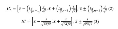 El siguiente paso es generar el intervalo de confianza para las medidas de desempeño; en el caso de los edificios son simulaciones terminales o edificios de negocios donde todas las personas salen del sistema al final del día y la distribución es de una población normal. Se utiliza la fórmula dos (2), pero si maneja otro tipo de distribuciones porque la población no es normal, la fórmula sería la tres (3), como se muestra a continuación: