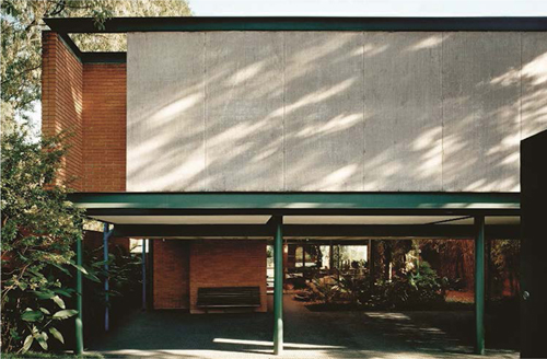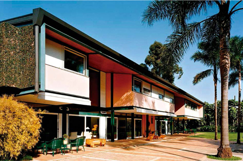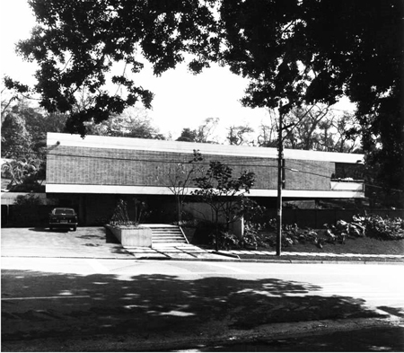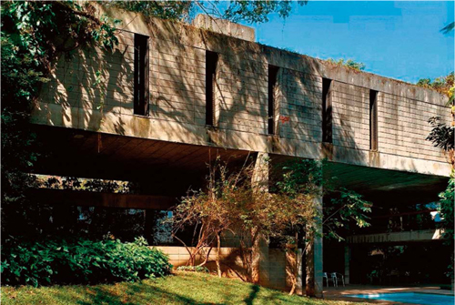Con todo, las referencias externas eran casi más importantes en aquellos años de formación. Los estudiantes, y los profesores también, se vinculaban por afinidades plásticas o políticas a uno u otro gran arquitecto internacional. Los más prestigiados eran Le Corbusier, claro, y Frank Lloyd Wright; así mismo, Walter Gropius, que se identificaba inmediatamente con la formación Bauhaus. Mies van der Rohe, evidentemente, era muy conocido también y su arquitectura elegante y detallista muy apreciada11, pero, para la realidad constructiva del Brasil de aquellos años, las propuestas miesianas se tornaban inalcanzables. Construir con acero y vidrio, en la escala industrial que el alemán desarrollaba en Estados Unidos, no pasaba de ser una realización inalcanzable para los profesionales brasileños y de sueños utópicos para los estudiantes. El material dominante en aquellos años era el hormigón armado, y el maestro que mejor lo trabajaba era Le Corbusier, así que muchos, siguiendo esa línea, se sumergieron en el estudio de las obras del arquitecto franco-suizo. Otros, más atentos a la multiplicidad de materiales artesanales, que eran más usados también en el Brasil, prefirieron seguir las enseñanzas de Frank Lloyd Wright, como fue el camino de Artigas, por lo menos durante sus primeros años de actuación, y fue también el camino de Eduardo de Almeida que se encantó con la sensibilidad del estadounidense que establecía una relación entre el proceso del proyecto y la materialidad definida para el mismo. No era igual proyectar con ladrillos que con bloques, con hormigón o con acero. La materialidad de la obra merecía una aproximación diferente que afectaba la manera de proyectar. Los wrightianos, a los cuales pertenecía Almeida, desenvolvían un trabajo que incorporaba un elaborado proceso geométrico aunado a la definición precisa de un material específico para construir, todo dentro de una lógica espacial abierta y de proporciones cuidadas.