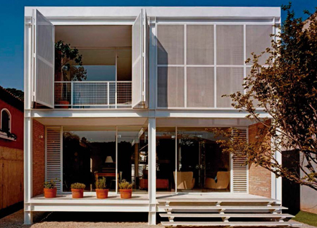 Almeida continúa usando la estructura metálica en las casas que proyecta durante los años noventa, como es el caso de la casa para Cidinha Brito, también conocida como Pacheco e Silva, en el barrio Alto de Pinheiros (1993) (Figura 14), donde recupera las ideas de transparencia y de modulación del proyecto del Parque dos Príncipes. Pero la mudanza de los materiales y sus texturas, especialmente la sustitución del ladrillo visto por la pared enlucida, y el cambio del tubo redondo por el cuadrado para la estructura metálica, da una nueva perspectiva para el conjunto que se presenta más armonioso y leve. El proyecto de la casa demuestra una evidente intención de "controlar la luz y tener respeto por el sol" (Almeida, 2014), lo que aunque parece evidente para un clima como el de Sao Paulo (tropical húmedo) no es una práctica común. Ventilar e iluminar, respetar la fuerza del sol, integrar la casa con el entorno y evitar que la construcción se transforme en una barrera, son imperativos que Almeida nunca deja de lado.