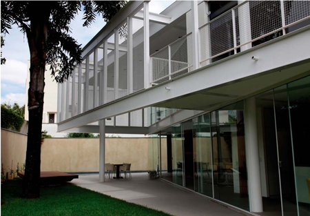 La casa de 200940 (Figura 22) para otro de sus hijos, Tácio, trabaja también esa idea del patio, solo que este se desplaza para el lateral, integrándose con el jardín. La organización volumétrica exterior remite a un volumen prismático completo que, sin embargo, se rompe en el interior creando una fuerte tensión entre esas realidades. Aunque el origen de esa tensión es de orden legal, pues el arquitecto necesitaba atender la legislación vigente, la solución del proyecto atiende a las mismas intenciones de crear espacios de transición que se verifican en la casa de su hermano, de 2004. La modulación, más compleja aquí que en aquella, se organiza con voladizos que imprimen liviandad a la volumetría dejando el piso superior prácticamente levitando sobre la planta baja.