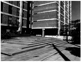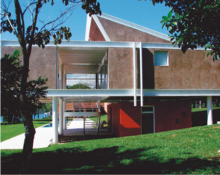 En 1985 proyecta para Vitor Oppenheim una residencia en el Parque dos Príncipes27 (Figura 12), un condominio residencial fuera de la ciudad de Sao Paulo, usando a la vista la estructura metálica con una postura plástica bastante próxima, por lo menos desde un punto de vista formal, a las propuesta del Nuevo Brutalismo inglés de los Smithson, que fuera desarrollado durante los años cincuenta28, claro que totalmente renovado e innovador. La levedad de la estructura metálica (aunque adecuada al cálculo de carga, con un diámetro de 15 cm) da una sensación de mínimo esfuerzo que se contrapone al peso de los elaborados muros de ladrillo que recuerdan los proyectos de inicio de los años setenta, especialmente los edificios Gemini.