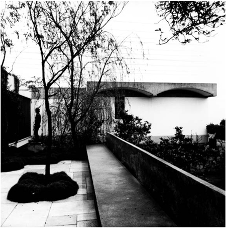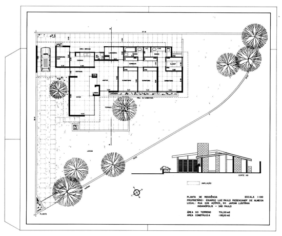 Su primera obra fue la residencia que proyectó para sí y su esposa en 195817. La casa fue construida en 1960 en el Jardim Lusitánia, un barrio noble fundado unos años antes cerca del Parque Ibirapuera (Figura 2). Obedeciendo un programa simple, dentro de una rígida disposición modular guiada por el elemento constructivo básico usado para construir la pequeña casa18, el bloque de hormigón, Eduardo de Almeida, siguiendo las enseñanzas sensibles de Wright con respecto a los materiales, desarrolló un proyecto rigurosamente modular, apoyado en ejes estructurales claros que dan un ritmo a la construcción.