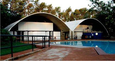 Con todo, Eduardo de Almeida mantenía viva su búsqueda experimental y aprovechó la encomienda de un "club" para los funcionarios de la fábrica Morlan23 (Figura 6) para desarrollar un edificio totalmente diferente, una cáscara dupla de hormigón armado. La arquitectura paulista había experimentado este tipo de construcciones desde los trabajos de Sérgio Ferro (1938), diez años antes, en la Casa de Bernardo Issler (1962), o todavía en la casa para Ernst y Amélia Império Hamburguer (1965) de Flávio Império (1935-1985) y Rodrigo Lefèvre (1938-1984). Pero la sutileza de las proporciones y la leve apariencia de las cáscaras dan al trabajo de Eduardo de Almeida una elegancia que no se encuentra en los proyectos más pesados y menos armoniosos de sus colegas paulistas. La modulación de los elementos de cierre es evidente y conversa con la curvatura ligeramente elíptica de las cáscaras; vidrios, paneles ciegos y las líneas curvas del hormigón se relacionan en franca congruencia formal dando al conjunto una unidad estructurada de belleza impar.