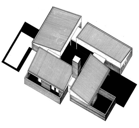 Los volúmenes de la casa se separan para formar un aglomerado que se identifica tanto con una casa como con un pequeño pueblo, donde el patio se transmuta en plaza y los ambientes en casas. Parece ser que reverbera aquí la famosa frase de Aldo van Eyck (1918-1999) (citado en Ligtelijn, 1999, p. 49)24, mas también de Artigas (2004, p. 121), "las ciudades como las casas y las casas como las ciudades". Los espacios se establecen de acuerdo con los ejes de circulación "que separan y unen [los ambientes] creando la autonomía de sectores [donde se dan los diferentes usos]" (van Eyck citado en Ligtelijn, 1999, p. 49) que el arquitecto resuelve con su proyecto. La estructura abierta de la casa, que recuerda también la propuesta de van Eyck sobre los edificios, que tienen que respirar (p. 115), permite las vistas a través de la construcción puesto que "el edificio no puede ser un obstáculo en el paisaje" (Almeida, 2014), la construcción tiene que abrirse, fraccionarse, para que el aire y la vista pasen, la atraviesen, la ventilen, pero también la conecten con el entorno. Arquitectura sustentable que se incorpora al medio natural donde se localiza. Arquitectura amigable con el terreno.