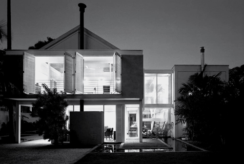 La casa toda es una sucesión de articulaciones. Entre exterior e interior vemos siempre un espacio, un vestíbulo, que como lugar de transición ejerce ese poder de poner en suspensión las dos realidades, la cubierta y la descubierta. van Eyck lo llamaría de umbral38 y Hertzberger de intervalo39, Eduardo de Almeida lo asocia al alpendre que, desde la época colonial, es una forma brasileña de estar, al mismo tiempo, afuera y adentro. Las terrazas de la casa, en los dos pisos, disponen de este tipo de ambiente que dialoga con las realidades fenomenológicas extremas, al mismo tiempo en que nos protege del sol y del agua. El patio interno es también un elemento de transición y de relación entre los espacios privados del piso superior y los públicos, o sociales, de la planta baja. El patio, como en las casas coloniales, es el punto de unión también entre la entrada y la cocina, aunque en esta casa contemporánea nada es tan separado.