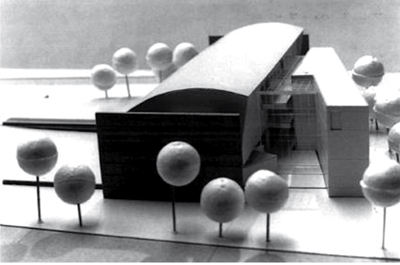El trabajo arduo y constante con proyectos de casas, más o menos grandes, "sirve como materia de reflexión para proyectos mayores" (Almeida, 2014), es el caso del proyecto para el concurso internacional del Museo Constantini30 (1997), también conocido como Malba (Figura 15), donde el arquitecto brasileño propuso una gran estructura metálica que fracturaba el conjunto en dos bloques que dialogaban a través de un espacio abierto que formaba una plaza pública, un foyer, abierto a la ciudad. La separación entre los volúmenes deja también respirar el edificio que con todo se abre hacia un espacio lateral del terreno de forma franca, creando un espacio semicubierto que garantiza una importante protección térmica para el interior.