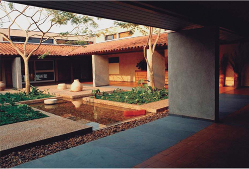 Es interesante ver cómo los proyectos que el arquitecto ha realizado durante su vida profesional conversan entre sí. El casco de la estancia Água Comprida (1990-2000)31 (Figura 16), en el Estado de Minas Gerais, es un buen ejemplo de cómo la casa de playa de la Baleia (1973-74), con sus articulaciones alrededor a un patio se desenvuelve de una manera compleja en esta enorme residencia campestre, donde, también, es importante la relación con el entorno. El patio central organiza la casa y también da sentido a la circulación que, sin embargo, se estructura como en los claustros conventuales, pero el pórtico no se cierra con la volumetría de las habitaciones, sino que se abre en los cantos diversificando los sectores, al mismo tiempo en que permite que el espacio escape, así como la vista y el viento. El tratamiento paisajístico del interior del patio, así como del entorno garantizan una relación controlada con la naturaleza que, en este caso, es desmesurada. Frente a ese imponente entorno Almeida se propone hacer una arquitectura equilibrada y sobria, pues no le "interesa hacer una arquitectura que grite mucho"32 (Almeida, 2014).