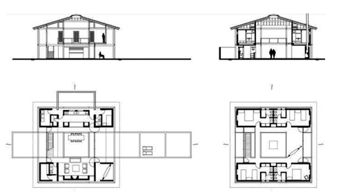 Las referencias a arquitecturas antiguas, como los claustros conventuales, también tienen su lugar en la producción del arquitecto que cultiva una basta erudición. La casa que proyectó para su familia en Paraty (Estado de Rio de Janerio, 1998)33 (Figura 17) es un trabajo de lectura de alguno de los principios palladianos de una cubierta y una organización volumétrica que dialoga bajo ella, como en la Villa Capra (La Rotonda, 1566). Nuevamente un patio central (de hecho la sala con la chimenea) que organiza las actividades y que se comunica con el piso superior. Solo que el impulso de relacionar el interior con el exterior, que es una constante del trabajo del arquitecto, se materializa aquí con la construcción de una "vía" que atraviesa el volumen principal y se enlaza con el jardín exterior creando una relación de pertenencia que se identifica en la repetición mimética del módulo estructural en el dibujo del piso. La estructura y la modulación se unifican en una única realidad espacial y plana que unifica el conjunto de la obra, esto es, la construcción y su territorio.
