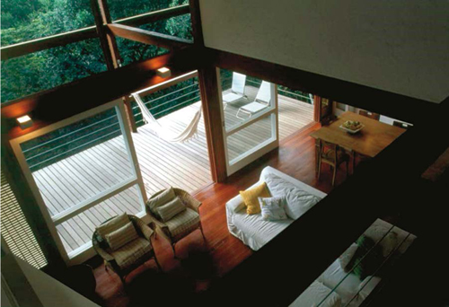 La estructura de madera sustituye a la estructura metálica en la casa de playa que proyectó para Ricardo Lacerda Soares para la playa Vermelha, en Ubatuba (2001-02)34 (Figura 18), aunque el raciocinio es similar. La organización interna es compacta y se resuelve siguiendo el módulo básico estructural de la casa; así, arquitectura y construcción son una única posibilidad de existencia del hecho arquitectónico que ya había sido resuelto en el proyecto. La integración con la naturaleza es total, la casa fluctúa sobre el terreno dejando las copas de los árboles entrar por la terraza del piso noble.