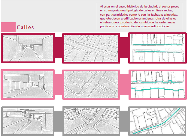 Este análisis también muestra la relación entre la forma de la calle sobre la definición de sus planos laterales (figura 3), observado en la presencia de calles con edificaciones discontinuas en su fachada. Este estudio también se ha realizado para la tipificación de espacios abiertos como plazas, plazuelas y cruces, ya que la percepción como espacio contenido urbano, lleva a identificar problemas que pueden ser abordados en el diseño.