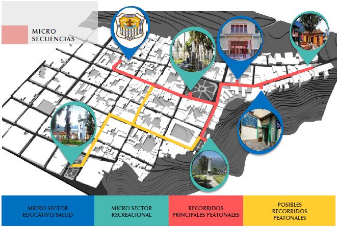 Los recorridos de vocación educacional, religiosa y sociocultural, residencial y de servicios, en conjunto con los nodos de encuentro, se vinculan con los recorridos peatonales. En este sentido, las microsecuencias identificadas en la figura 4, evidencian la comprensión del análisis y las posibilidades que representan para conceptualizar, pues parte del tratamiento en el mediano y corto plazo incluye la articulación del espacio público a través de secuencias que otorgan carácter al paisaje.