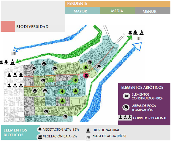 Sobre el atributo de biodiversidad se han analizado los elementos bióticos, abióticos y la conectividad. En cuanto al primero, la cobertura vegetal representa el 20% versus la superficie edificada; el arbolado en espacios abiertos se limita a dos plazas existentes en el sector; el área libre del interior de las manzanas se observa con poca vegetación, sin embargo se puede recuperar con acciones a mediano y largo plazo. No existe variación en el color de la vegetación del lugar y muy poca según las estaciones climáticas durante el año. Sobre el medio abiótico, las pendientes del espacio urbano siguen los rangos más cercanos al 12% en dirección norte y menores del 6% en dirección sureste. No existen elementos que ofrezcan protección al peatón frente a las precipitaciones o al sol. En cuanto a la conectividad, se observa poca relación entre los recorridos, los espacios naturales y la concentración de personas en calles (figura 5).