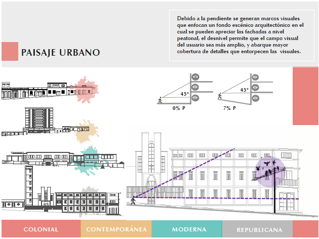 Además de destacar la altura de las edificaciones de cara a las visuales hacia los fondos escénicos (figura 7), también cabe mencionar la identificación de tipologías arquitectónicas que complementan la lectura de las capas históricas del paisaje urbano del sector. Los patrones determinados colonial, republicano, moderno y contemporáneo, sirven como base para el tratamiento de fachadas. Este aspecto ofrece la oportunidad de diferenciar microsecuencias y otorgar carácter a cada una, lo que incide positivamente en la lectura y orientación en el sector.
