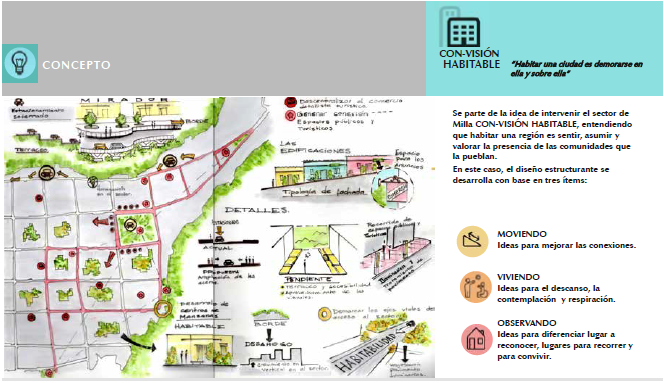 Se parte de la idea de intervenir el sector de Milla CON-VISIÓN HABITABLE, entendiendo que habitar una región es sentir, asumir y valorar la presencia de las comunidades que la pueblan. En este caso, el diseño estructurante se desarrolla en base a tres ítems: MOVIENDO: Ideas para mejorar las conexiones; VIVIENDO: Ideas para el descanso, la contemplación y respiración. OBSERVANDO: Ideas para diferenciar el lugar a reconocer, lugares para recorrer y para convivir (Briceño, Gordon, Lobatón, Márquez, Peña, 2015).