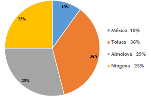 Existe la evidencia de un mayor arraigo hacia la ciudad de Toluca 36%), ya que varios de ellos expresaron ser ahí donde realizan el mayor número de actividades, siendo para ellos Almoloya de Juárez (poblado cercano) una especie de ciudad satélite. México, de ambigua interpretación por referirse igualmente a la denominación del estado, o del país obtuvo escasa frecuencia (10%) y la opción de ninguna alcanzó un 25% lo que corrobora la falta de vínculo con el espacio que se habita (Figura 10).