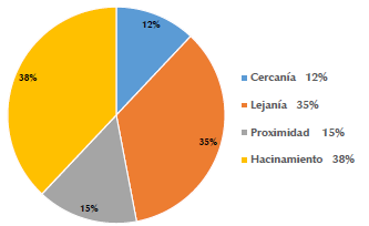 Así como el arraigo, el sentido de proximidad con el otro complementa también la idea de vivir en sociedad. Para la idea de reconocimiento de sí mismo, es necesaria una construcción social que reafirme al hombre, que le haga sentirse aceptado en un grupo social, donde la familia resulta una célula básica que se complementa en núcleos cada vez mayores, como el grupo de amigos, los compañeros de trabajo, los vecinos, etc. La casa podría considerarse un escenario de estos vínculos sociales, inicialmente en el seno de una familia y posteriormente amistades, vecinos, etc. En este sentido, la idea de proximidad y cercanía se contrastó con la idea de hacinamiento, con el fin de comprobar que la distancia física no es considerada necesariamente en un sentido positivo. La hegemonía del concepto de hacinamiento (nuevamente concentrada mayormente en los habitantes del Modelo Malva) cubrió en un 38% la frecuencia de respuestas, mientras la proximidad y cercanía, aparentemente ideas cercanas no fueron relacionadas metafóricamente con las casas de Rincón del Álamo. La idea de lejanía, considerada también como un concepto negativo en un hogar tuvo una frecuencia de 35%, por encima de proximidad y cercanía que no rebasaron un 15% y 12% respectivamente (Figura 11).