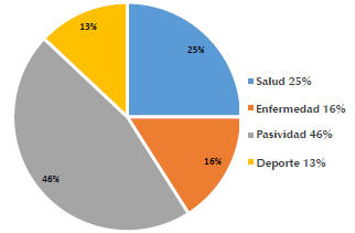 Los conceptos presentados fueron: salud, enfermedad, pasividad y deporte, a lo que la respuesta general fue sentirse más estrechamente ligados con el termino de pasividad (46%) que, con los conceptos extremos, como salud y deporte o enfermedad (Figura 12).