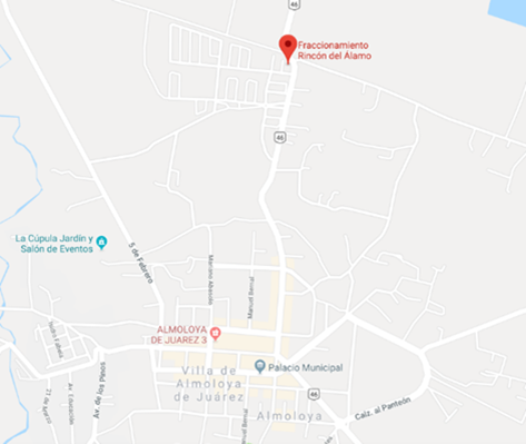 Goolgle maps.(2015). [Mapa de Fraccionamiento Rincón de Álamo, México en Google maps] Recuperado de https://www.google.com.mx/maps/place/Fraccionamiento+Rinc%C3%B3n+del+%C3%81lamo/@19.3801982,-99.7629941,16.08z/data=!4m5!3m4!1s0x85d279a34490e81f:0x103f0f0d8e283ca0!8m2!3d19.380376!4d-99.757495?dcr=0.